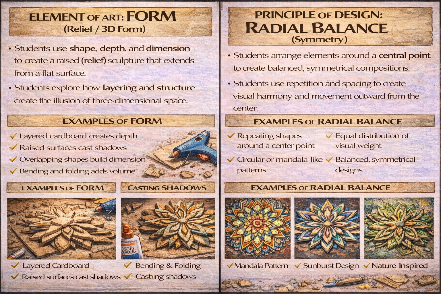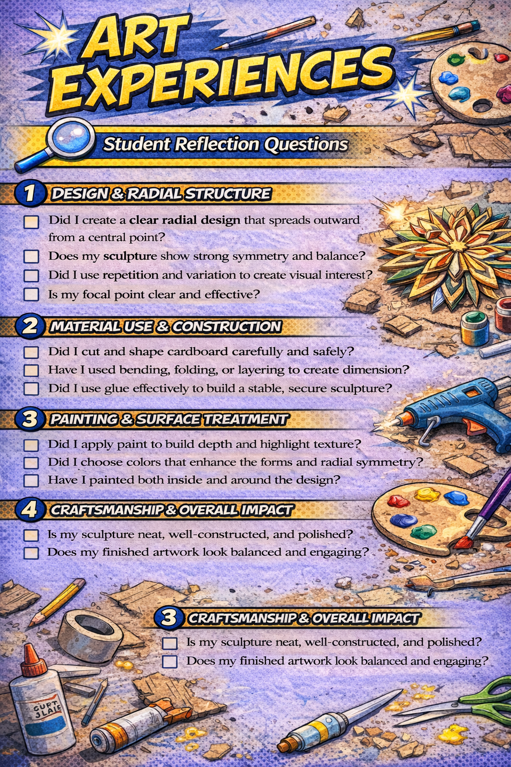 In this project, students will design and create a radial relief sculpture using cardboard as the primary material. By cutting, shaping, layering, and gluing cardboard pieces, students will build a raised (relief) composition that radiates outward from a central point. Once constructed, the sculpture will be enhanced with paint to emphasize depth, contrast, and visual movement.