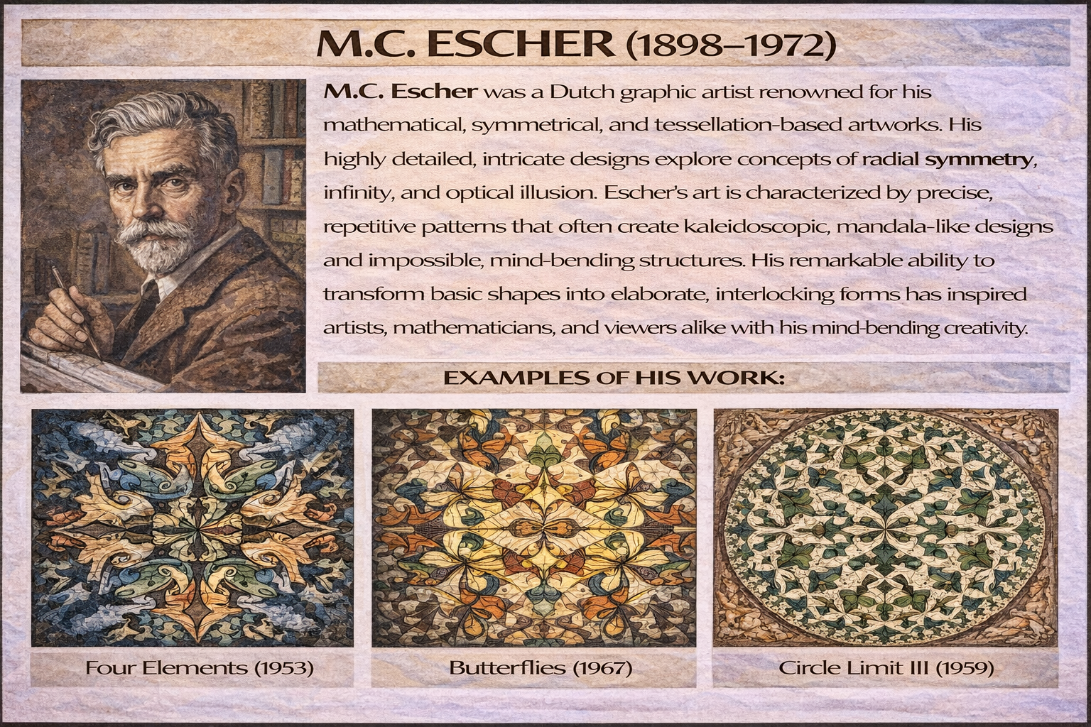 * Identify how art connects to real-world structures, patterns, and natural forms (e.g., radial designs in nature like flowers or mandalas).
