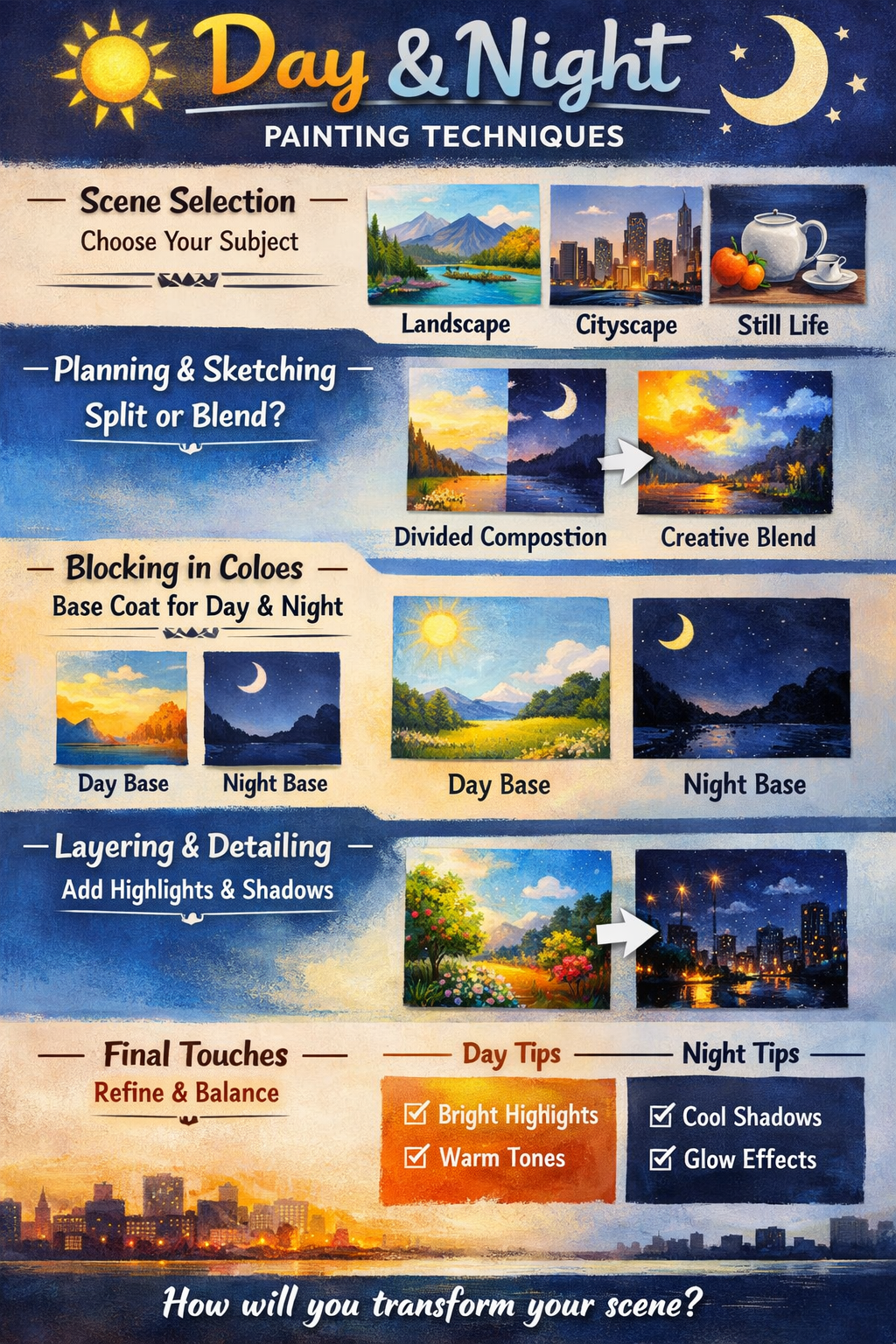 Consider how the same scene changes under sunlight versus moonlight. Could reflections, shadows, or artificial light add interest? How can you blend realism and abstraction to make day and night feel connected yet distinct?