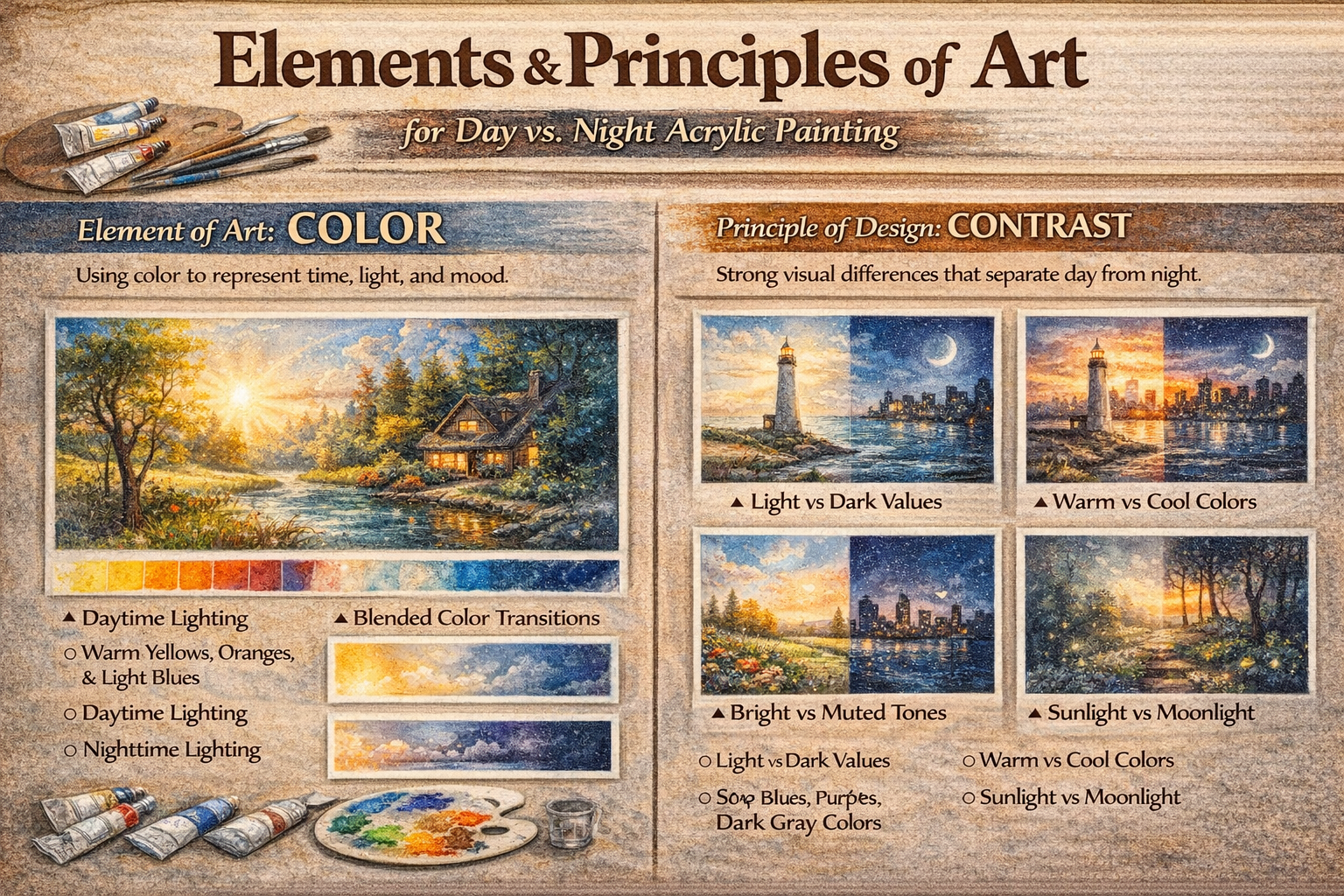 In this advanced acrylic painting project, students will depict the same scene under two different lighting conditions: day and night. The painting can be realistic, showing the natural changes in light and color, or more abstract, blending day and night elements creatively into one composition.