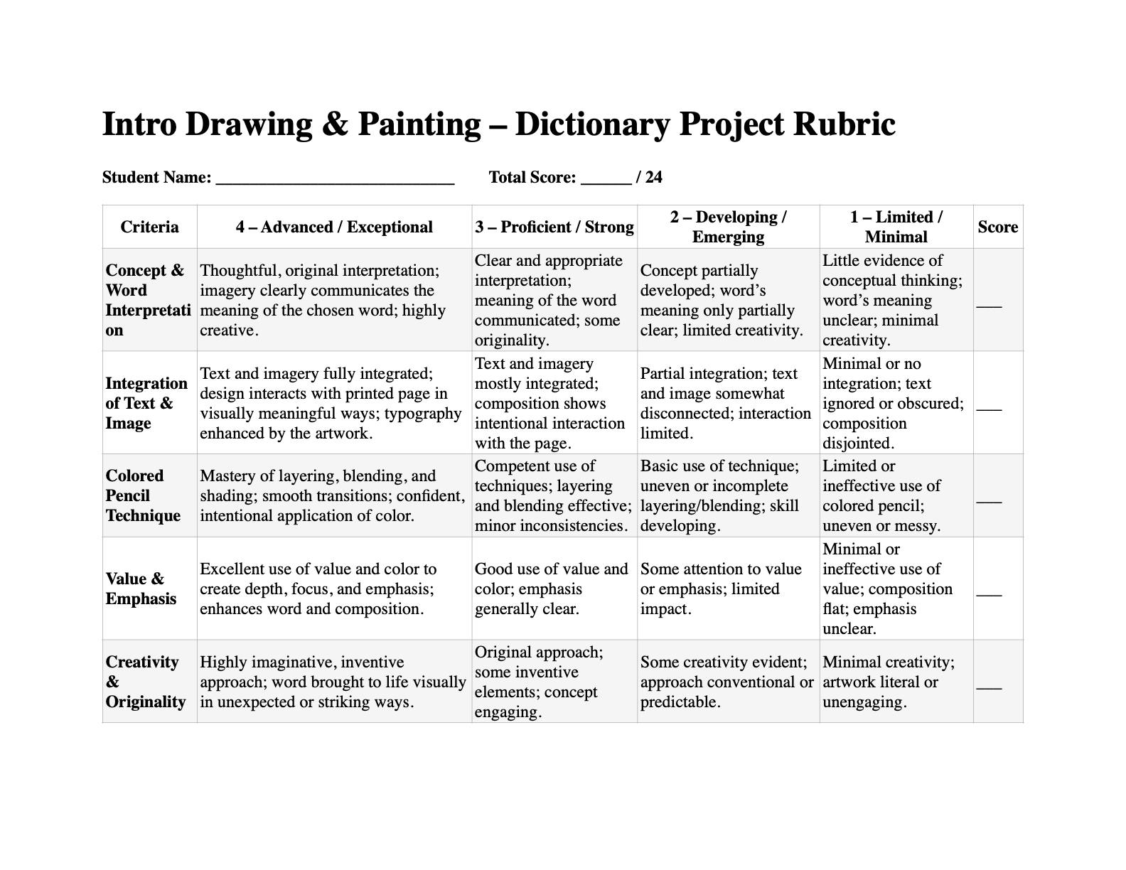 The final artwork should creatively interact with the printed page—allowing the definition and typography to remain visible while enhancing the word through symbolic, literal, or imaginative imagery. This project combines drawing skills with creative thinking and visual storytelling.