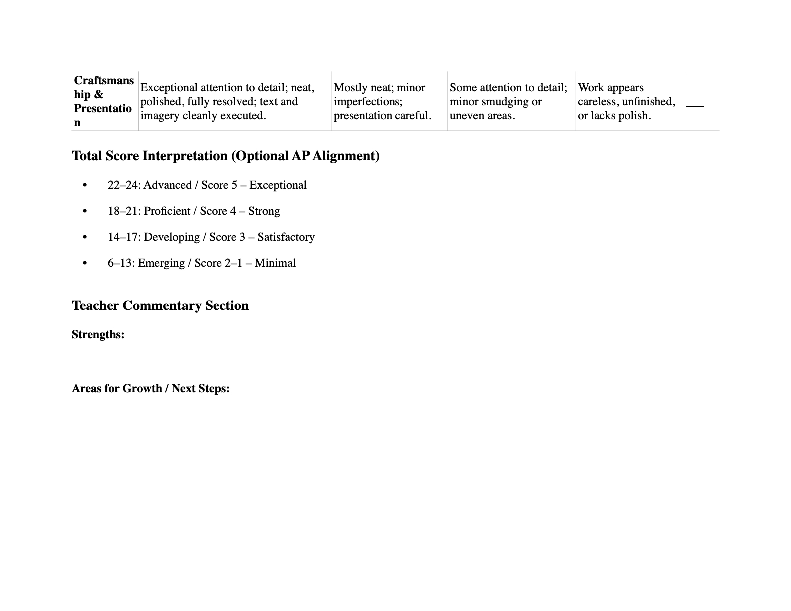 A student reflection is a brief, thoughtful explanation of how and why a student created their artwork, including the choices they made, challenges they faced, and what they learned during the process. In art, reflection is important because it helps students develop critical thinking, recognize growth, strengthen their creative decision-making, and take ownership of their artistic development.
