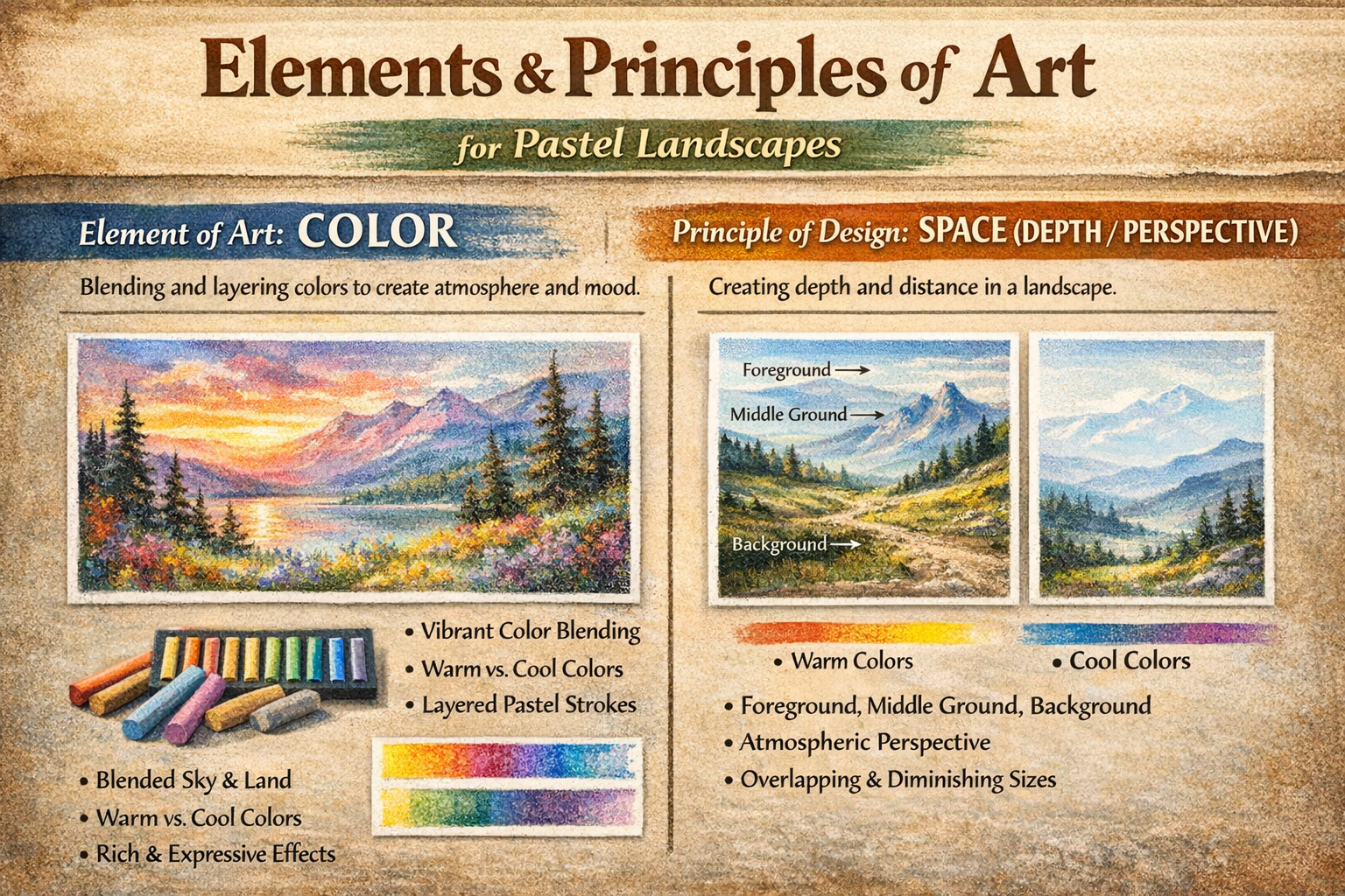 In this chalk pastel landscape project, students will explore how color, layering, and blending can be used to create depth and atmosphere in a natural scene. Using chalk pastels, students will study landscapes—such as mountains, forests, deserts, beaches, or rural settings—and translate their observations into a vibrant, expressive composition.