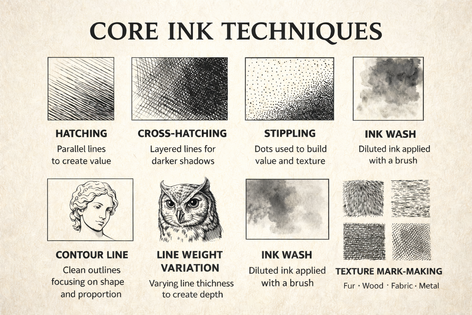 * Cross-Hatching – Layered directional lines to deepen shadows.
