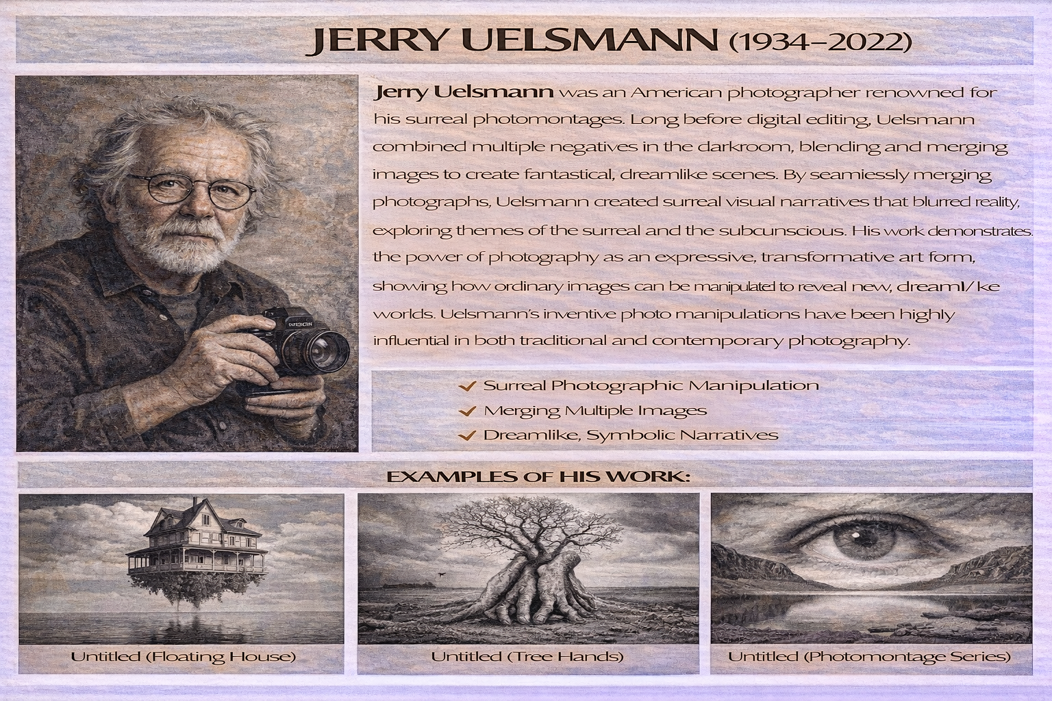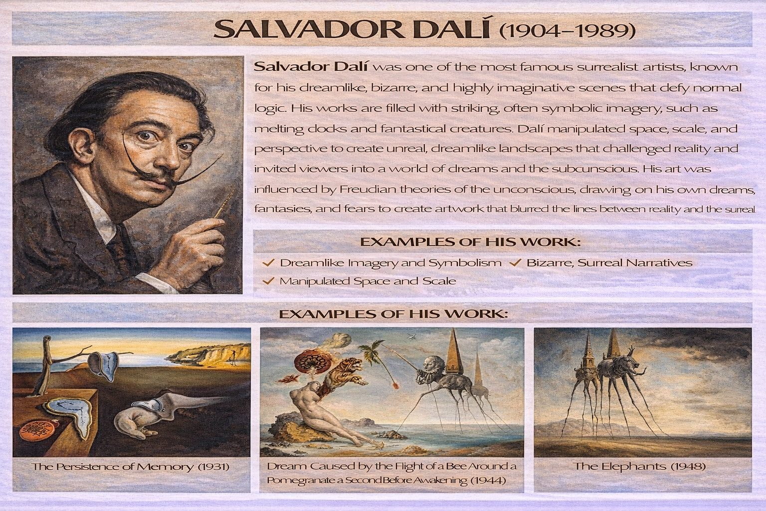 Inspired by Surrealist artists such as Salvador Dalí, René Magritte, and contemporary digital and analog photo-manipulation artists, students will investigate how unexpected juxtapositions, scale shifts, dream logic, symbolism, and altered environments can reveal psychological, emotional, or conceptual truths. Rather than documenting reality, this project asks students to transform it.