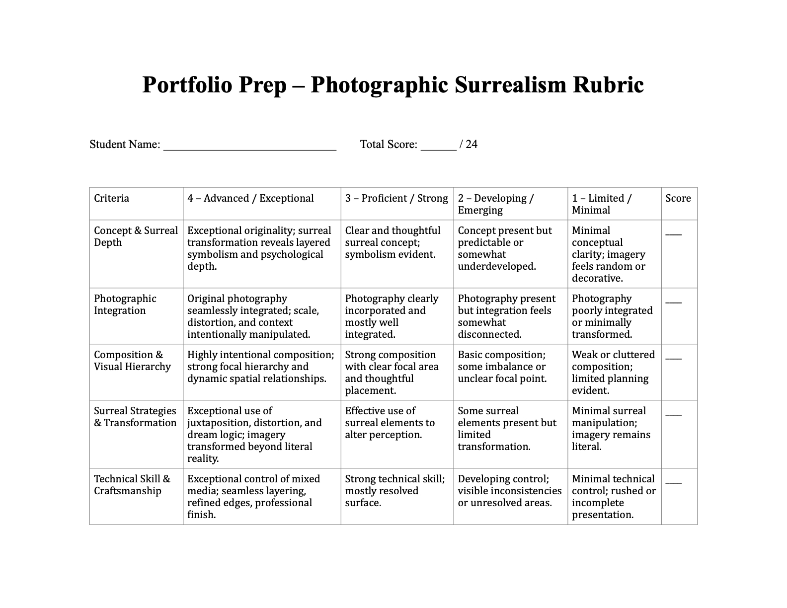 In this AP-level mixed media assignment, students will create a highly resolved artwork that explores photographic surrealism as a vehicle for self-expression. Through the integration of personal photography and surrealistic imagery, students will construct a visually compelling collage that challenges reality, distorts perception, and communicates layered meaning.