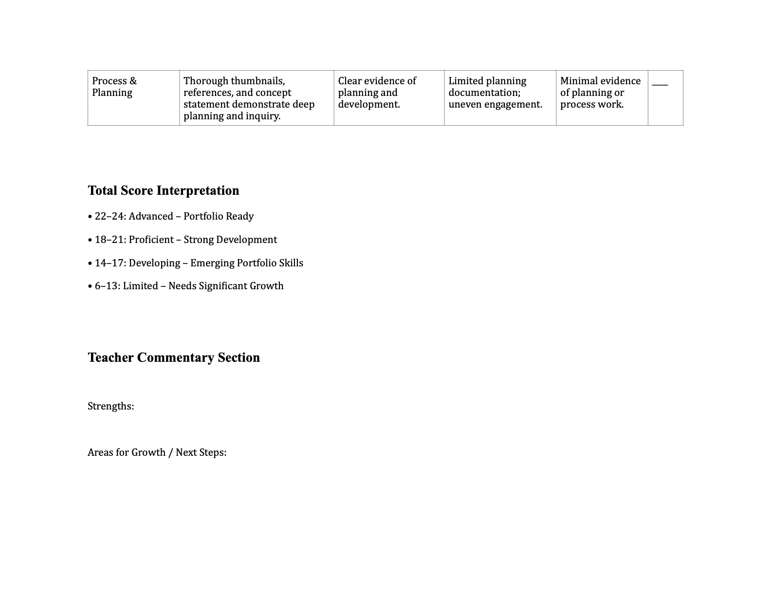 * Evaluate growth in both conceptual thinking and technical execution consistent with AP Studio Art expectations.
