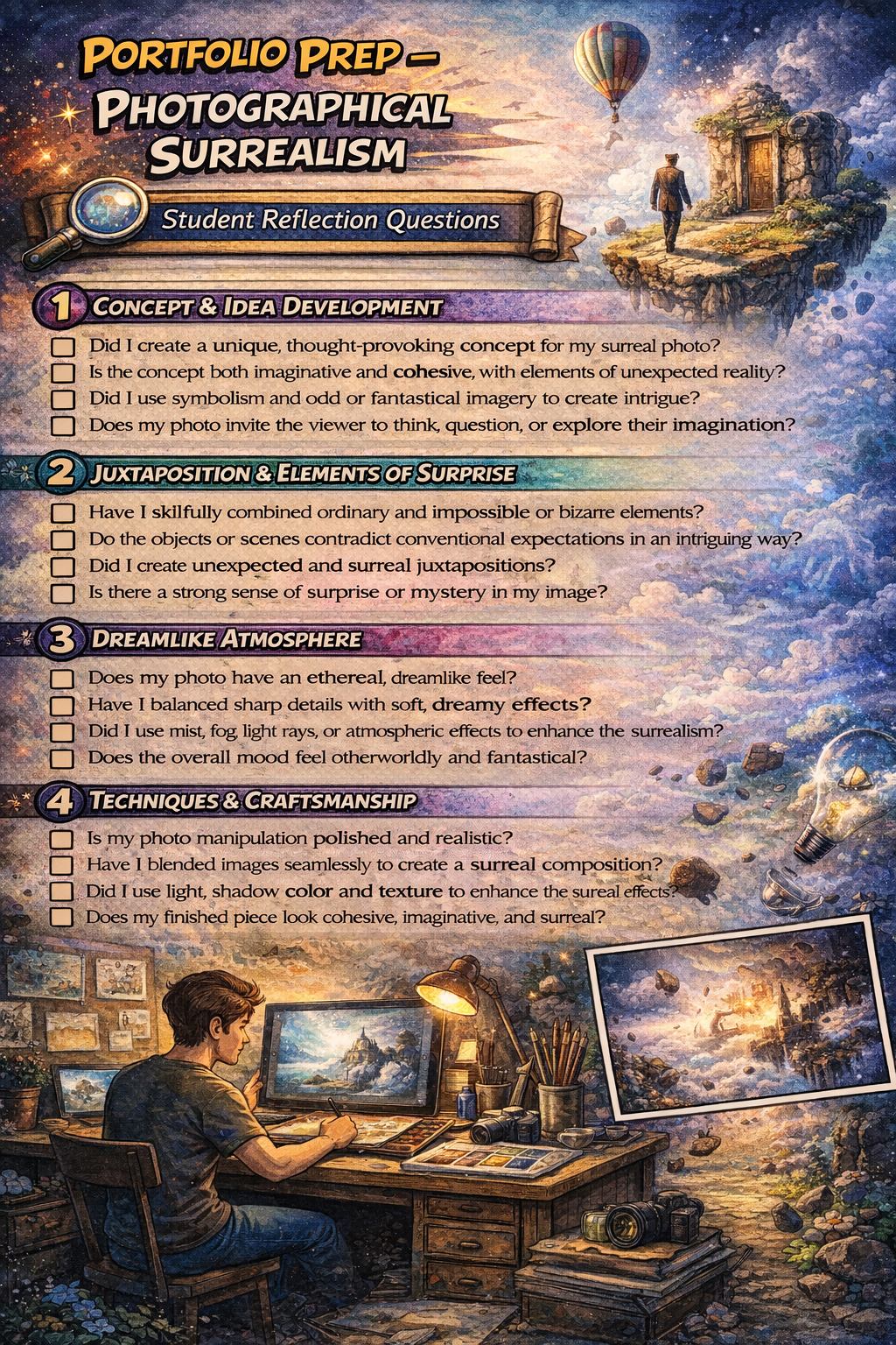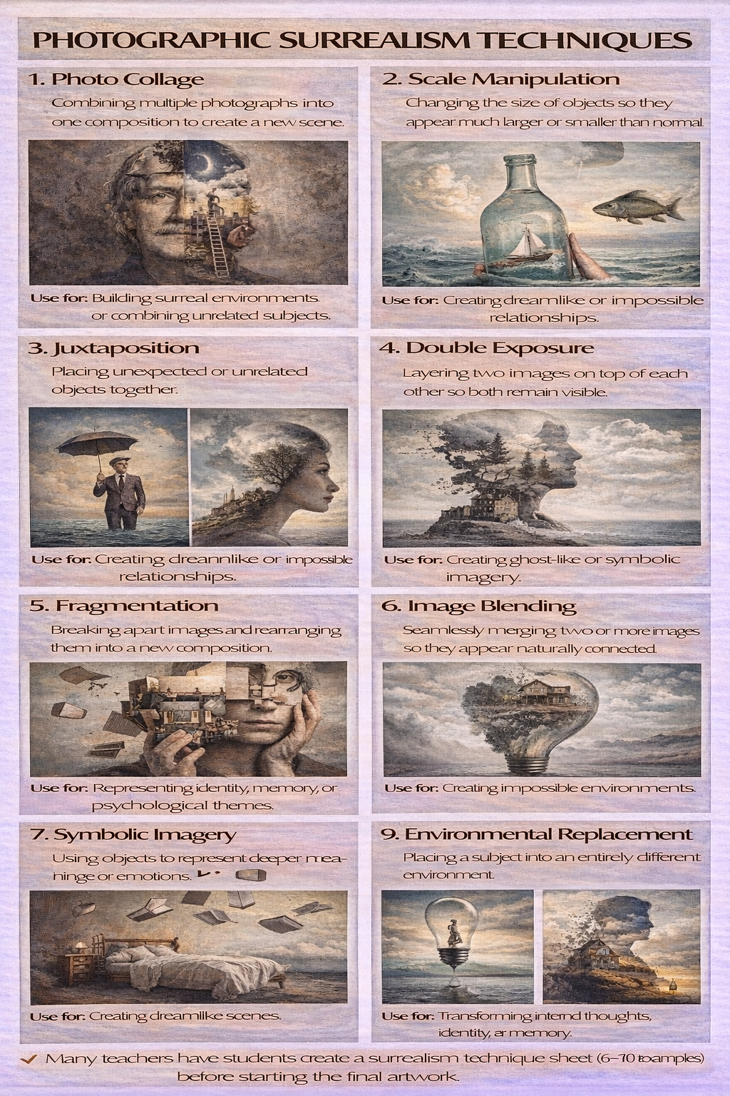 * Students analyze historical and contemporary surrealist artists and photo-manipulation practices to inform compositional and conceptual decisions.