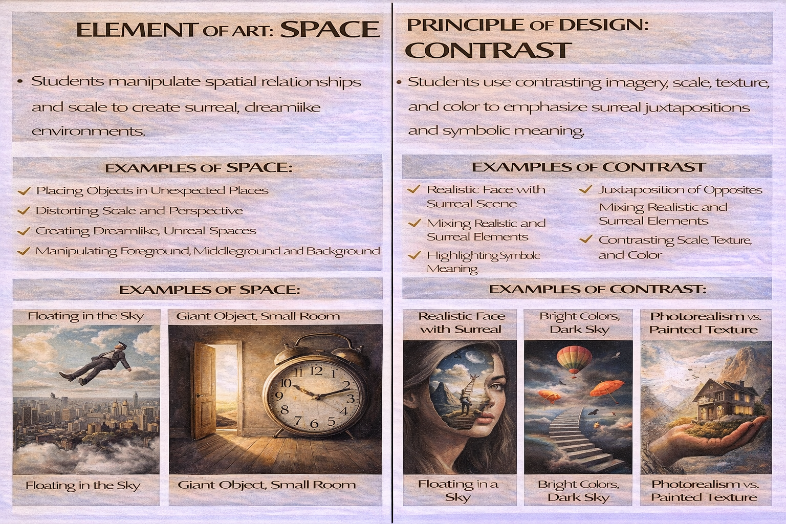 * Students connect personal narratives, identity exploration, and emotional experiences to surrealist visual strategies.