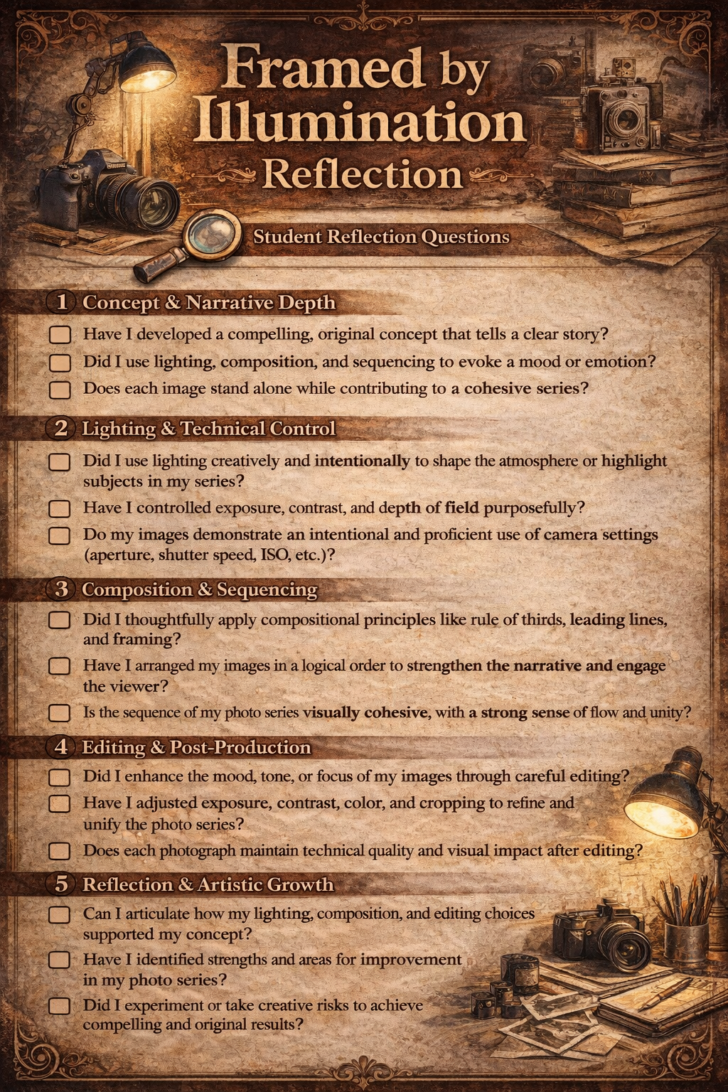 Framed by Illumination emphasizes that photography is not simply about capturing images—it is about constructing meaning. Through deliberate control of light and composition, students will transform individual photographs into a unified visual narrative that engages, challenges, and resonates with the viewer.