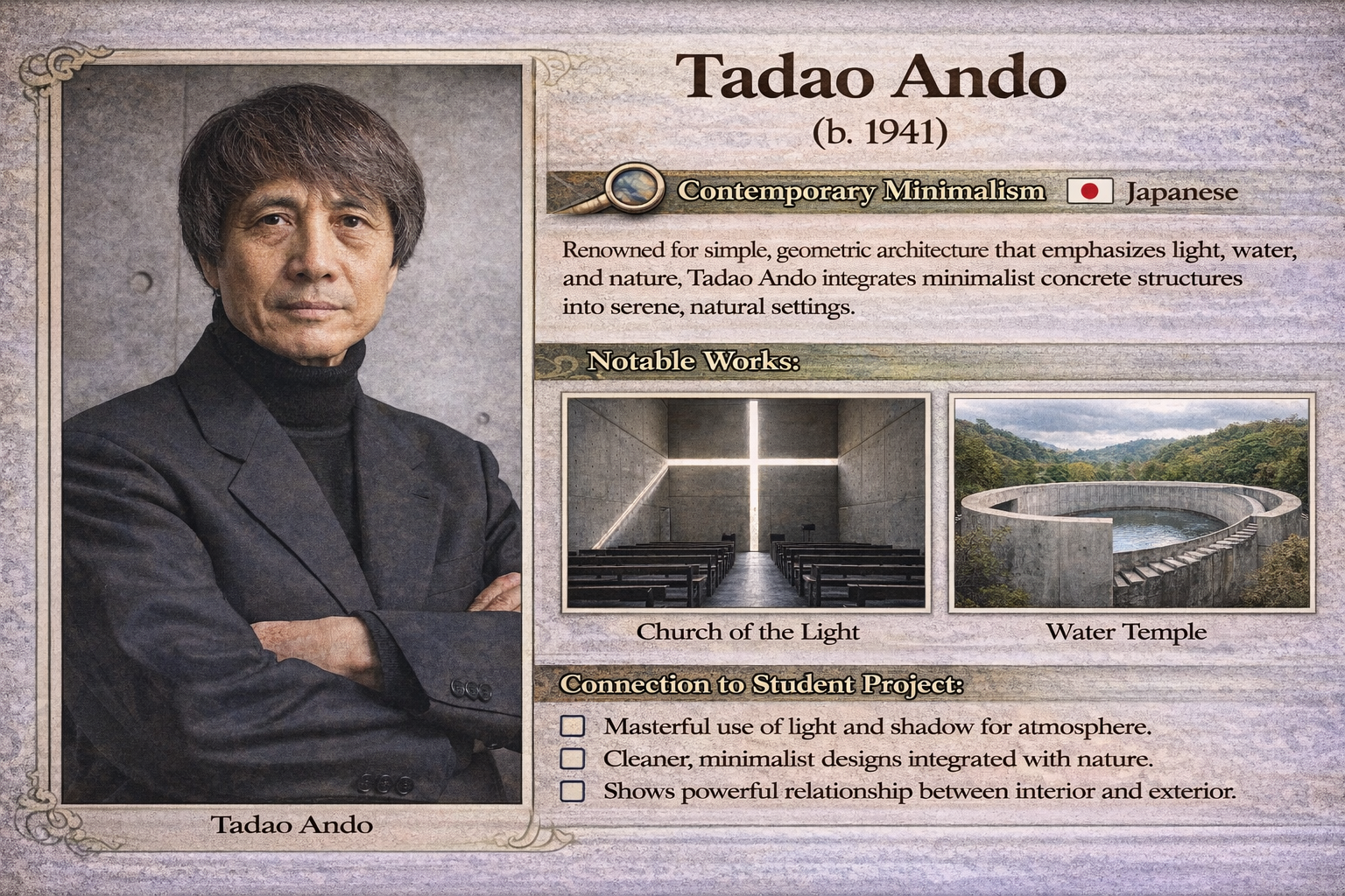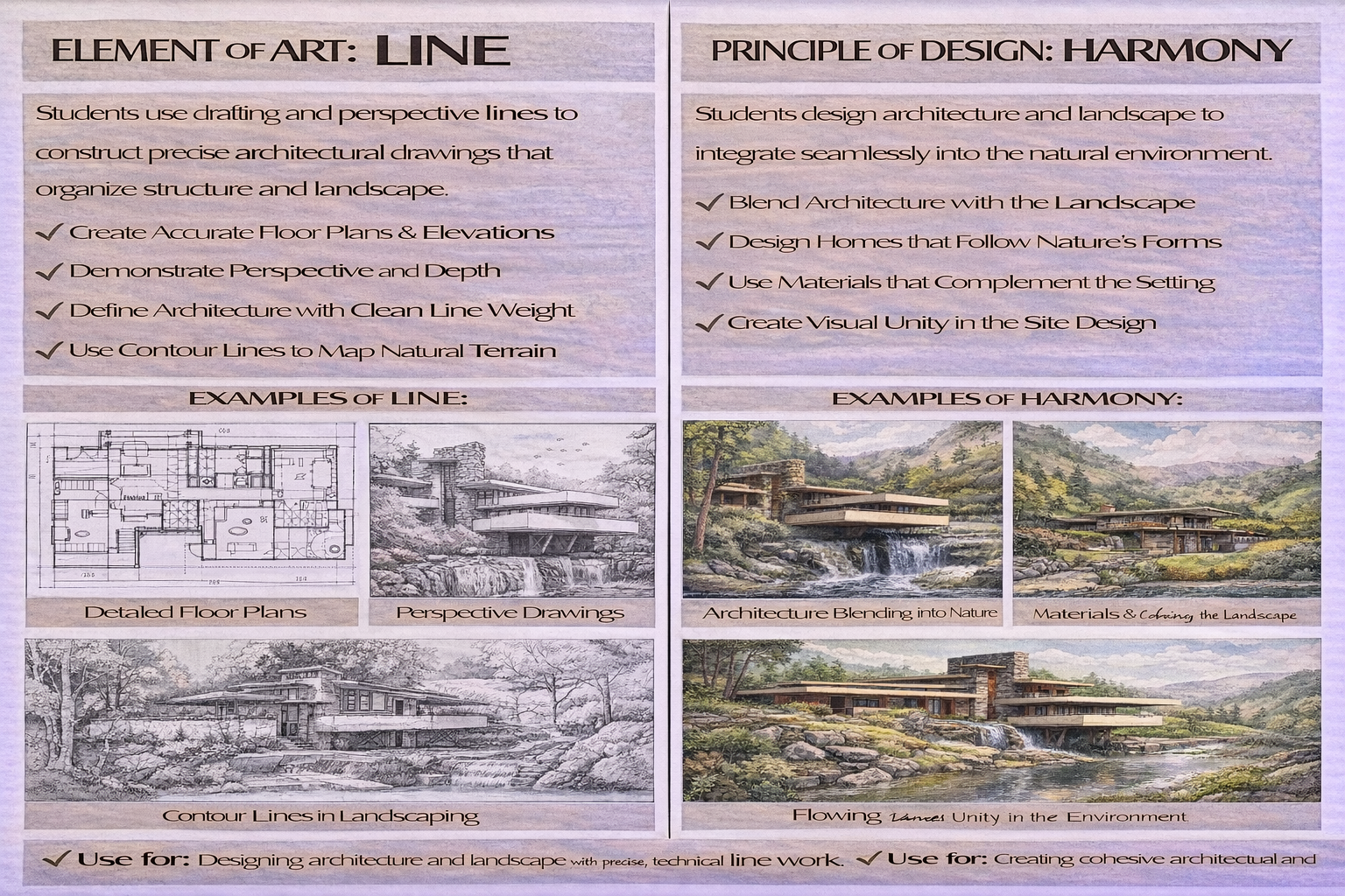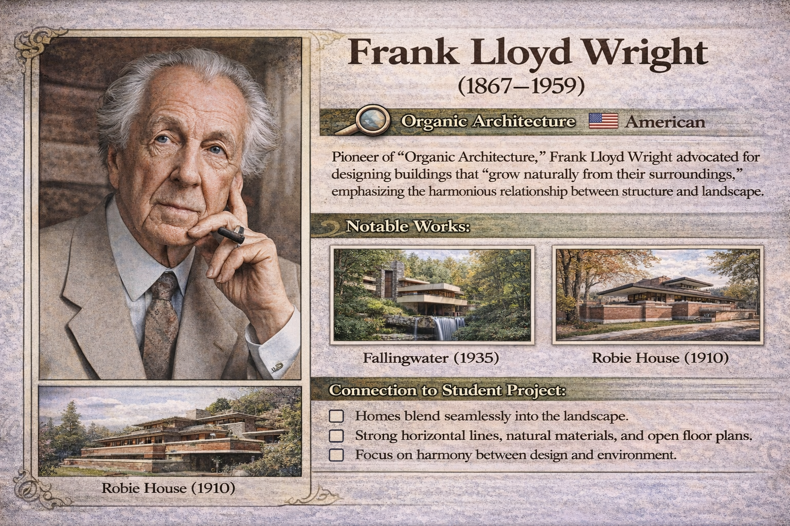 Inspired by the organic architecture of Frank Lloyd Wright, students will examine how built structures can harmonize with nature. Wright believed architecture should grow from its surroundings rather than dominate them. Students will explore how line, proportion, balance, and material choice influence both aesthetic and functional design.